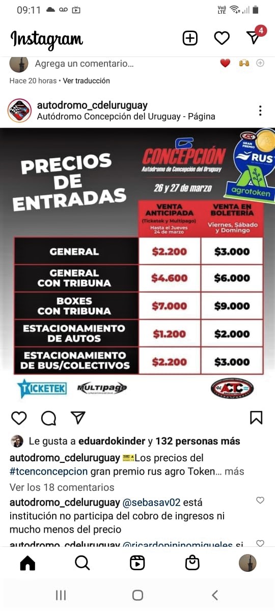 Se pueden adquirir los tickets de forma anticipada a través de las plataformas de internet Ticketek y en las sedes de Multipago, la red de cobros que opera en el litoral argentino. La General cuesta $ 2.200 (sin acceso a tribuna) y $ 4.600 (con acceso a tribuna); el paso a boxes vale $ 4.600 (sin acceso a tribuna) y $ 7.000 (con acceso a tribuna). En tanto, el estacionamiento para autos y pick up tendrá valor de $ 1.200, mientras que para camiones y buses $ 2.200. Menores de 10 años no abonan entrada.