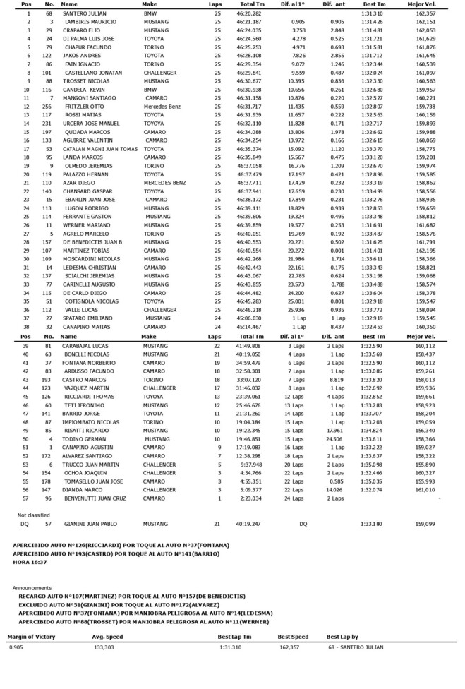 El piloto del BMW Motorsport lideró de principio a fin y se defendió con éxito de Elio Craparo (Ford Mustang) en la largada y en los tres primeros relanzamientos (en el tercero, con una maniobra que estuvo bajo investigación de los comisarios deportivos), y de Mauricio Lambiris (Ford Mustang) en la cuarta y última reanudación, a cuatro giros de la bandera a cuadros.